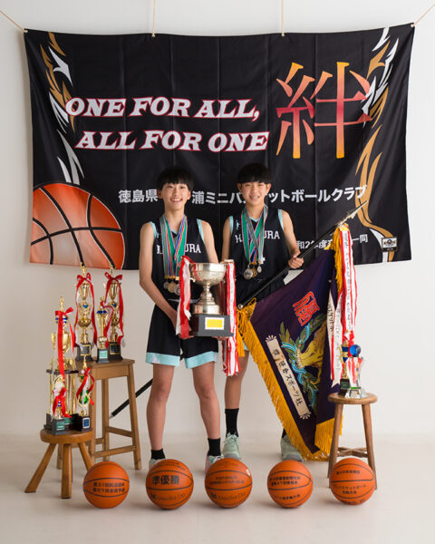 6年生のミニバス卒部記念に、メンバー全員で記念写真を撮られました。この一年間で手に入れた数々の賞杯やトロフィーは、チームみんなの努力の結晶ですね。
