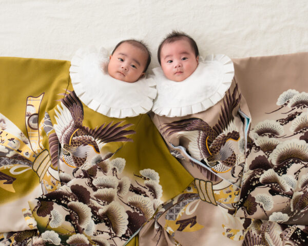 お宮参りの記念撮影でした。双子ちゃんということで、同じ柄の色違いの祝着で撮影させていただきました。仲良く寄り添う姿が、なんとも愛らしい一枚になりましたね。