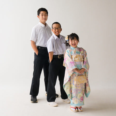 七五三の兄弟フォトは、タカツ写真館でも毎年人気の撮影メニューです。一見、一人で撮るより難しそうに思われる兄弟撮影ですが、実はご一緒の方が安心して自然な笑顔が生まれやすいんですよ。年齢の離れたお兄ちゃん・お姉ちゃん用のジュニア着物も豊富にご用意しております。ご家族の思い出づくりにぜひご利用くださいませ。