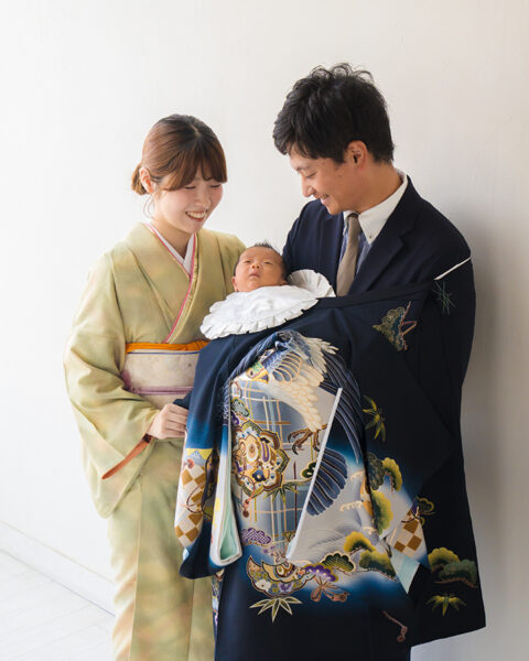 お宮参りの記念にご家族写真を撮影されました。ご両親の腕の中で、すっかり安心して今にも眠りそうな赤ちゃんの表情が、なんとも微笑ましい一枚になりましたね。これから始まる子育ては、きっと大変なこともあると思いますが、天使のような一年をどうぞ楽しみながら見守ってあげてください。