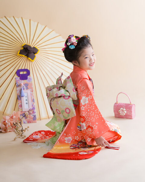 七歳の七五三は、女の子が初めて帯を結ぶ「帯解(おびとき)」の儀といわれる、日本の伝統行事です。かつては、子ども用の紐付きの着物から大人と同じ帯に変わる節目に、その成長を祝ったそうですが、お子さんの健やかな成長を喜ぶ気持ちは、今も昔も変わりませんね。スタジオ撮影では、定番のお着物姿はもちろん、ドレス姿での撮影も人気です。ヘアメイクは提携の美容室を特別価格でご利用いただけますので、お好みのスタイルをご相談ください。また、別料金にはなりますが、ご希望の方には日本髪のヘアセットも可能です。和の美しさを引き立てる特別なスタイルを、ぜひお楽しみください。