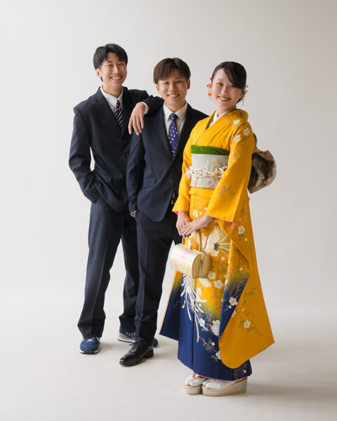 成人式の記念に、ご兄弟で写真を撮影されました。七五三や入学など、節目ごとに残してきた記念写真も、ご家族の成長とともに、だんだんと機会が少なくなっていくものですね。お子さんが成人を迎えるこの時期は、ご家族それぞれが新しい道へと踏み出しはじめる、「特別な節目」なのかもしれません。スタジオで過ごすひとときが、いつか家族をつなぐ思い出として、心に残る宝物になりますように。