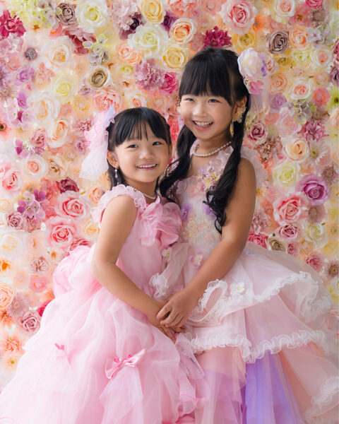 姉妹一緒に七五三の記念写真を撮影されました。フラワーウォールを背景に、ピンクでそろえたドレスとおふたりの笑顔がよく映える、とてもキュートな一枚になりましたね。まもなく11月、七五三の本格的な参拝シーズンが始まります。タカツ写真館では、撮影とプリント(またはデータ)の合計が36,300円以上の方は、神社への平日お出かけが無料(※土日は9,350円)となっております。お出かけ用のお衣装が重なる場合もございますので、日程がお決まりの方はどうぞお早めにお電話でご予約くださいませ。
