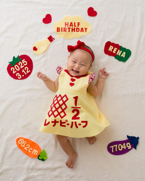 10月も終盤を迎え、ようやく金木犀が秋らしい香りを運んでくれるようになりました。気候もすっかり穏やかになり、スタジオではハーフバースデー記念など、赤ちゃんの撮影が続いています。タカツ写真館には、脚立を使わず安全に、真上からのアングルで撮影できるロフト設備があります。今、子育てで使っているおもちゃやお気に入りの道具を並べて撮るのも、きっと思い出に残る、楽しい記念になりますね。