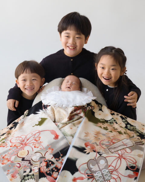 お宮参りの記念に、ご兄弟でお写真を撮られました。お兄ちゃんお姉ちゃんたちの元気な笑い声をよそに、すやすや眠る弟さんの寝顔が、なんとも微笑ましい一枚になりましたよ。