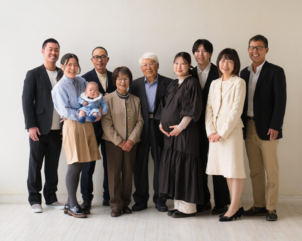 おじいちゃんとおばあちゃんを囲んで、4世代そろってご家族写真を撮られました。普段は離れて暮らしているご家族にとっては、ただ集まって写真を撮るだけでも、なんでもない一日が特別な記念日に変わるように感じます。