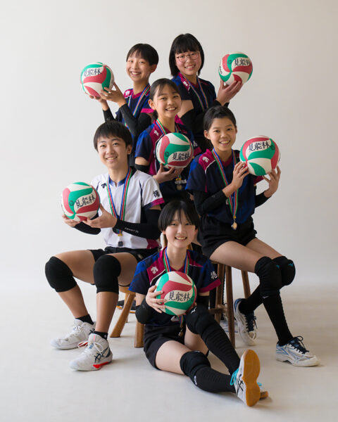 バレーボールチームの卒部記念を撮影させていただきました。6年生メンバーはみんな終始笑顔で、試合のときのように息の合ったフォーメーションが、とても楽しい一枚になりましたよ。